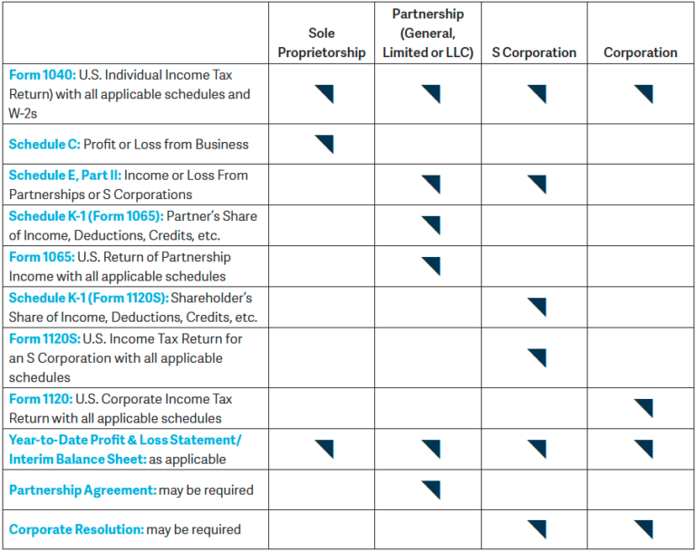 NOTE: All documents must be from the most recent 2-year period. The borrower must sign all tax returns and year-to-date information. Request business tax returns when the borrower has 25% or greater ownership interest in a business.